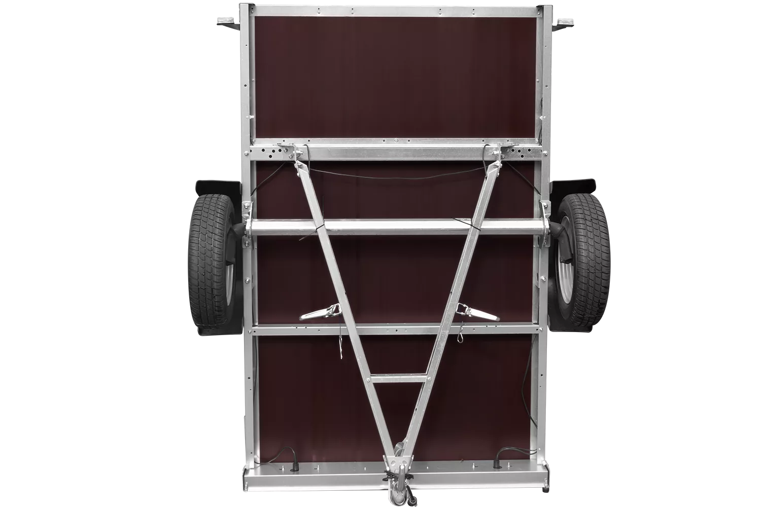 • Kippbare V-Deichsel, die jederzeit unter der Bodenplatte des Anhängers eingeklappt werden kann